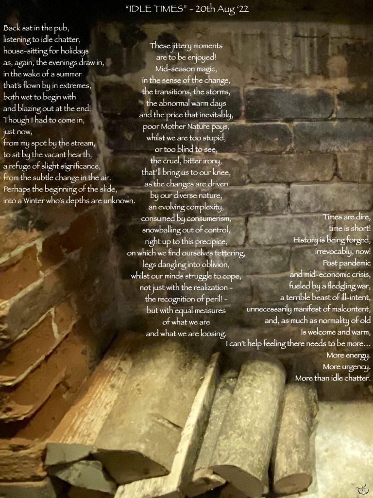 My publishing this poem (or piece of #Poetography – #IdleTimes) now marks the year, pretty much, since both the start of the war and since I caught Covid! (Interestingly, it was two years to the day yesterday that I got my first jab – don’t get me started on the anti-vaxers and conspiracy theories!) It’s been a year of lingering brain-fog that’s made me feel like I’ve been stripped of my ability to write, just when I was getting going with #THR33RINGS! Supremely frustrating on top of everything else!
